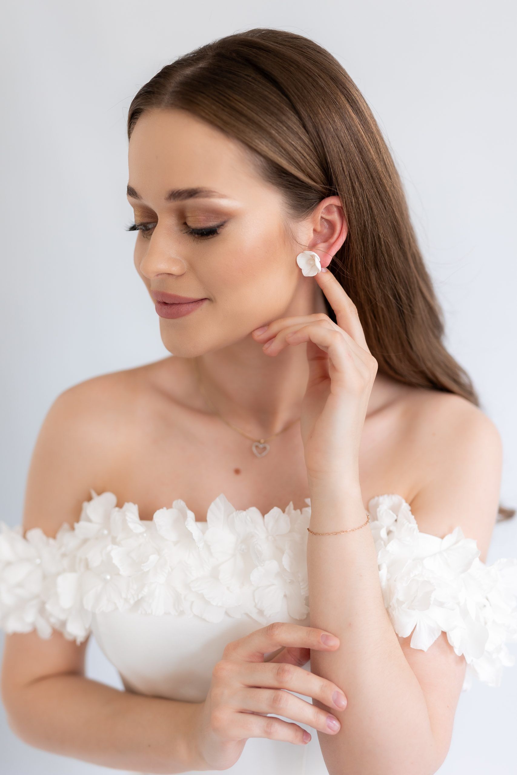A felhasznált porcelán virágok minden egyes szirma egyedileg, kézzel készül rendkívüli odaadással és figyelemmel. Ezek az egyedi, kézzel készített ékszerek nemcsak esztétikai szempontból kiemelkedőek, de strapabírók is. Jól ellenállnak a kisebb sérüléseknek, repedéseknek, így tartós választás lehet, amely akár emlékként is megőrizhető az esküvő után. A felhasznált porcelán lehetővé teszi, hogy a kiegészítő minden apró részlete egyedileg megformálható legyen. Ez különösen nagy előny, ha a menyasszony szeretné, hogy a fülbevaló tökéletesen illeszkedjen az esküvő tematikájához, a ruhához vagy akár a csokor stílusához.