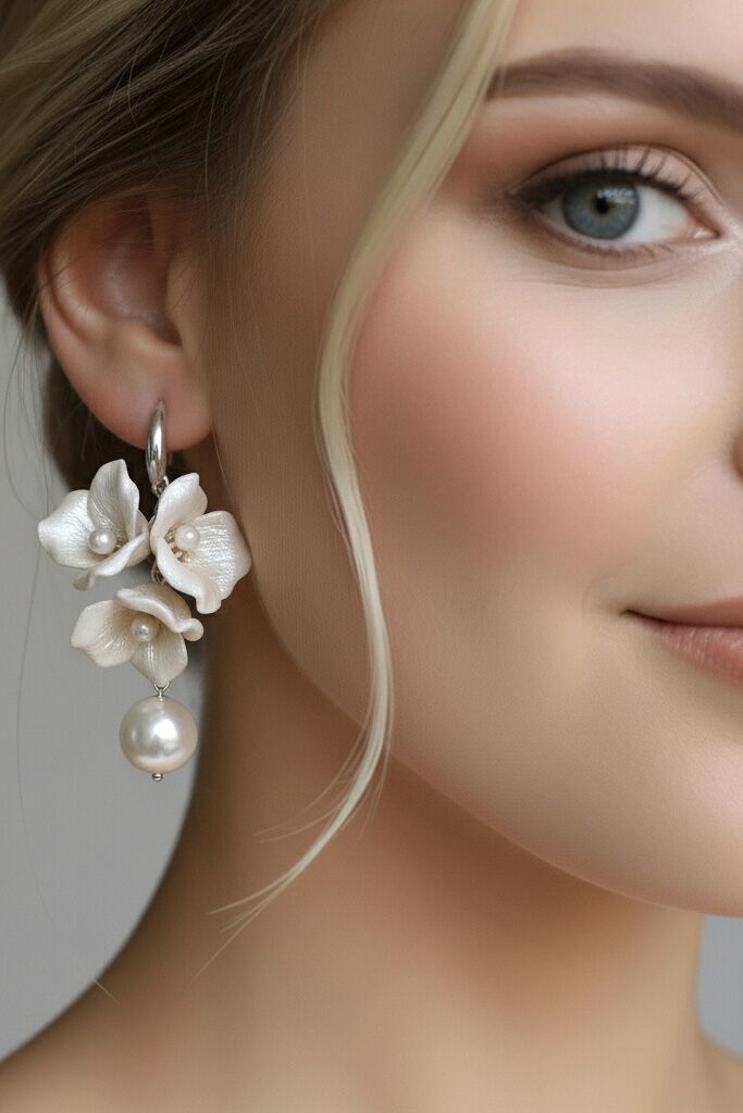 A felhasznált porcelán virágok minden egyes szirma egyedileg, kézzel készül rendkívüli odaadással és figyelemmel. Ezek az egyedi, kézzel készített ékszerek nemcsak esztétikai szempontból kiemelkedőek, de strapabírók is. Jól ellenállnak a kisebb sérüléseknek, repedéseknek, így tartós választás lehet, amely akár emlékként is megőrizhető az esküvő után. A felhasznált porcelán lehetővé teszi, hogy a kiegészítő minden apró részlete egyedileg megformálható legyen. Ez különösen nagy előny, ha a menyasszony szeretné, hogy a fülbevaló tökéletesen illeszkedjen az esküvő tematikájához, a ruhához vagy akár a csokor stílusához.