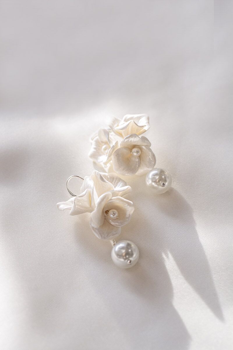 Az Iris porcelán virágos menyasszonyi fülbevaló három gyöngyházfényű, apró porcelán virágból áll, melyek közepén valódi igazgyöngyök ragyognak. A felhasznált virágok minden egyes szirma egyedileg, kézzel készül rendkívüli odaadással és figyelemmel.
