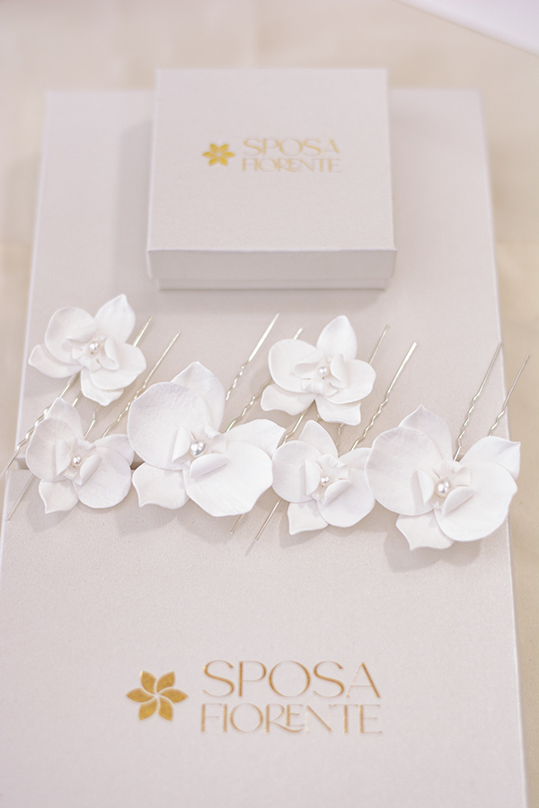 A szett összesen 6 darab gondosan kidolgozott hajtűt tartalmaz, amelyek három különböző méretű orchidea virágban pompáznak (minden méretből 2-2 darab található a szettben). A virágok közepén megbújó ragyogó igazgyöngyök gondoskodnak a prémium hatásról és a finom romantikáról.