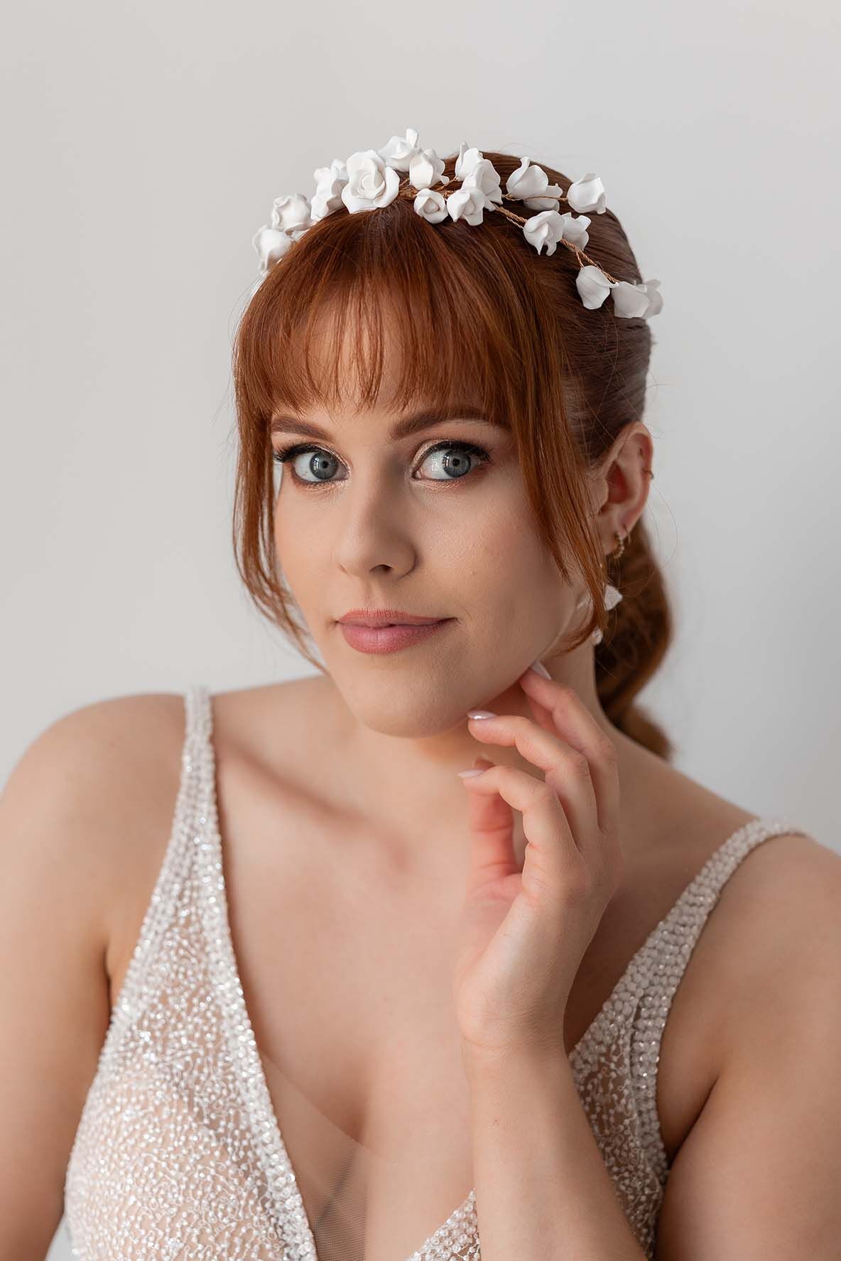 A Rosa fehér inda hajékszer apró, részletgazdag porcelán rózsákból van megformázva. A rózsa a szerelem, a szépség és a romantika örök szimbóluma, így ezt a hajdíszt olyan menyasszonyoknak ajánlom akik a klasszikus stílus kedvelői.