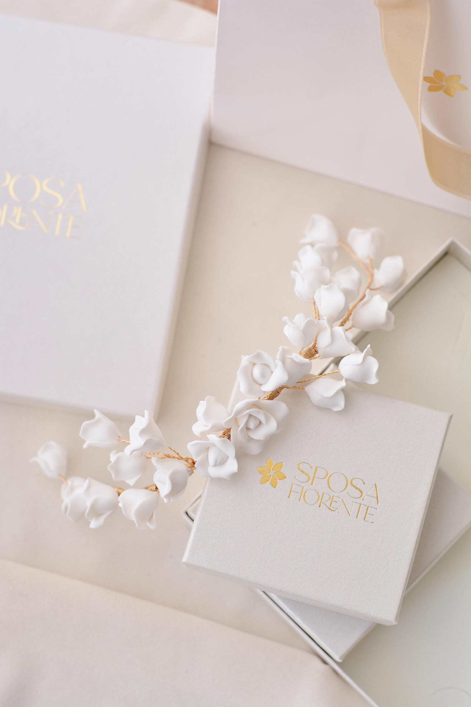 A felhasznált porcelán virágok minden egyes szirma egyedileg, kézzel készül rendkívüli odaadással és figyelemmel. Ezek az egyedi, kézzel készített hajékszerek nemcsak esztétikai szempontból kiemelkedőek, de strapabírók is. Jól ellenállnak a kisebb sérüléseknek, repedéseknek, így tartós választás lehet, amely akár emlékként is megőrizhető az esküvő után. A felhasznált porcelán lehetővé teszi, hogy az esküvői hajdísz minden apró részlete egyedileg megformálható legyen. Ez különösen nagy előny, ha a menyasszony szeretné, hogy a hajdísz tökéletesen illeszkedjen az esküvő tematikájához, a ruhához vagy akár a csokor stílusához.